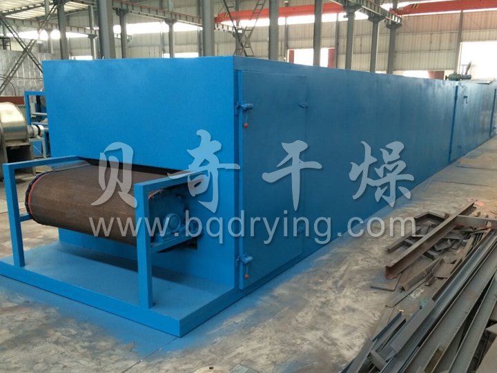 物料由加料器均匀地铺在网带上,网带一般采用12-60目不锈钢丝网,由传动装置拖动在干燥机内移动。干燥机由若干单元组成,每一单元热风独立循环,部分尾气由专门排湿风机排出,废气由调节阀控制,热气由下往上或由上往下穿过铺满物料的网带完成热量与质量传递的进程,带走物料水份。网带缓慢移动,运行速度可根据物料温度自由调节,干燥后的成品连续落入收料器中。上下循环单元根据用户需要可灵活配备,单元数量亦可根据需要选取。