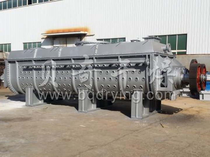 空心轴上密集排列着楔型中空浆叶,热介质经空心轴流经浆叶。单位有效容积内传热面积很大,热介质温度从-40℃到320℃,可以是水蒸汽,也可以是液体型:如热水、导热油等。间接传导加热,没有携带空气带走热量,热量均用来加热物料。热量损失仅为通过器体保温层向环境的散热。楔型浆叶传热面具有自清洁功能。物料颗粒与楔型面的相对运动产生洗刷作用,能够洗刷掉楔型面上附着物料,使运转中一直保持着清洁的传热面。浆叶干燥机的壳体为Ω型,壳体内一般安排二到四根空心搅拌轴。壳体有密封端盖与上盖,防止物料粉尘外泄而充分发挥作用。